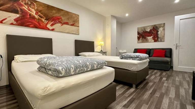 Die Ferienwohnung verfügt über ein Wohnzimmer mit einem Satelliten-Flachbild-TV und einer voll ausgestatteten Küche. Es stehen zudem Familienzimmer zur Verfügung. Die Unterkunft ist mit Heizung ausgestattet.