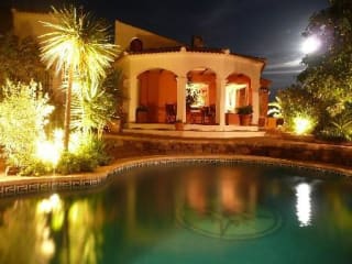 Von den verschiedenen Terrassen des Luxushauses hat man einen wirklich tollen Blick auf das nahe Mittelmeer, aber auch auf die im Winter schneebedeckten Berge der Sierra Nevada und an besonders klaren Tagen auch auf das Atlas-Gebirge in Marrokko. Neben einem kleinen, künstlichen Wasserfall - ca. 2,5 m hoch und abends per Schalter auf Wunsch sehr schön beleuchtet - werden Sie hier auch einen nach originalen Plänen erstellten Holz-Brotbackofen vorfinden. Der Brotbackofen kann selbstverständlich auch benutzt werden. Vor dem Haus gibt es eine überdachte Veranda, aber auch einen separierten, überdachten Bereich (mit Grill, extra Kühlschrank und Waschbecken), wo man gemütliche Grillabende verbringen kann. Bitte achten Sie darauf, daß ansonsten hier in Andalusien vor allem im Sommer wegen der Brandgefahr offenes Feuer verboten ist. Selbstverständlich stehen Ihnen auch genügend Sitzgelegenheiten und Liegestühle im Außenbereich zur Verfügung. Nach Cómpeta, dem nächsten Ort, sind es gerade einmal rund 5 km (ca. 5 - 10 Autominuten). Die Taxifahrer in der Umgebung nennen das Haus übrigens Finca Hollywood, da es in der Nacht so toll beleuchtet ist. Das gesamte Grundstück der Finca la Huerta ist ca. 5 Hektar groß, ca. 1.200 qm um das Haus herum sind komplett mit einem ca. 2 m hohen Zaun umgeben und der Teil hinter dem Haupthaus ist noch einmal separat mit einer Tür abgetrennt. Von daher ist dieses Domizil auch ideal für Hundebesitzer geeignet. Außerhalb des Zaunes reicht das Grundstück, auf dem Sie neben Oliven- und Avocadobäume auch wilden Spargel und Mangos sehen können, bis zur Schlucht hinunter - einfach nur Natur pur. Der nächste Nachbar wohnt ca. 100 m entfernt, so daß Sie in dem Finca la Huerta eine besonders private Atmosphäre genießen können. Die asphaltierte, sehr gut zu befahrende Straße bringt Sie von Cómpeta bis zur Haustür der Finca la Huerta. Wollen Sie hingegen den kürzeren Weg zum Meer fahren, so bedarf es hierzu ein klein wenig Mut, denn dieser, teilweise recht schlechte und enge Feldweg ist nicht befestigt und an manchen Stellen geht es an einer Seite steil bergab. Dafür sind Sie aber in knapp 30 Minuten (ca. 10 km) am Meer etwas westlich von El Morche (ca. 2 km westlich von Torrox Costa), wo Sie einen relativ breiten und nicht sehr stark besuchten Strand vorfinden werden. Einen Geländewagen benötigen Sie aber auch für diesen Weg nicht zwingend, allerdings ist es mit einem 4 x 4 Wagen natürlich wesentlich sicherer und auch angenehmer. Durchgeschüttelt wird man aber in jedem Fall, dafür sieht man auch einen kleinen "Wald mit Oleanderbäumen". Der nächste Flughafen in Málaga liegt ca. 60 Minuten in südöstlicher Richtung.