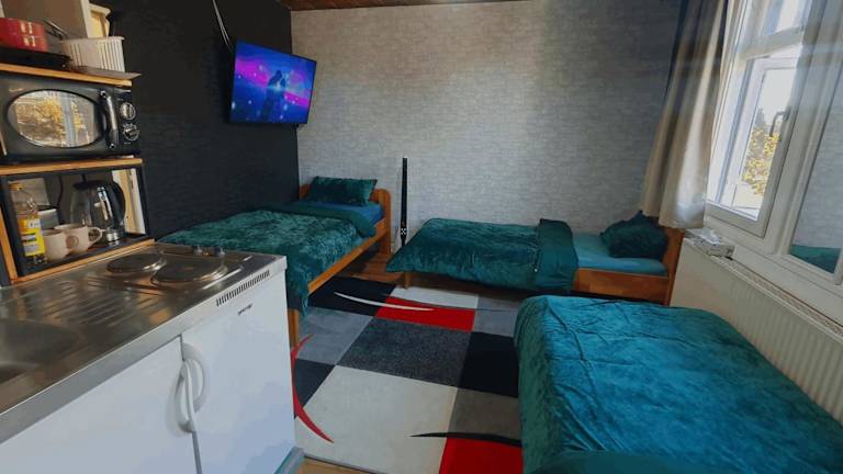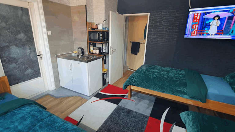 Die Ferienwohnung ist mit einem Flachbild-TV, einer Küchenzeile mit Kühlschrank und Mikrowelle ausgestattet. Handtücher und Bettwäsche werden bereitgestellt.