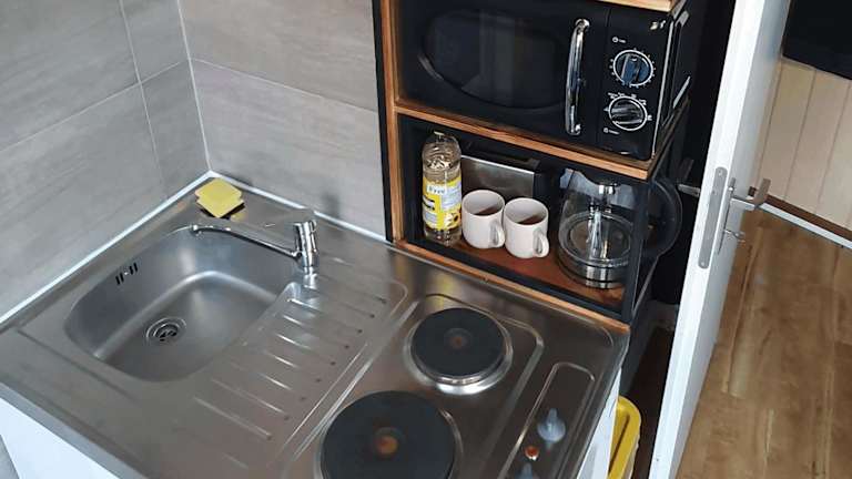 Eine Gemeinschaftsküche ermöglicht die Zubereitung eigener Mahlzeiten. Zudem gibt es vor Ort Möglichkeiten für die Essenslieferung.