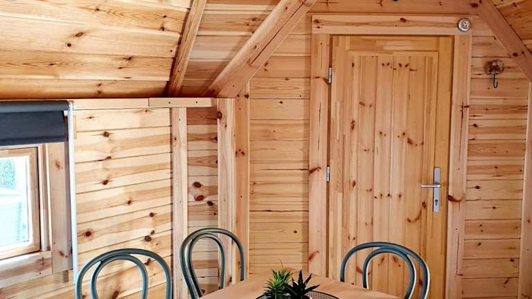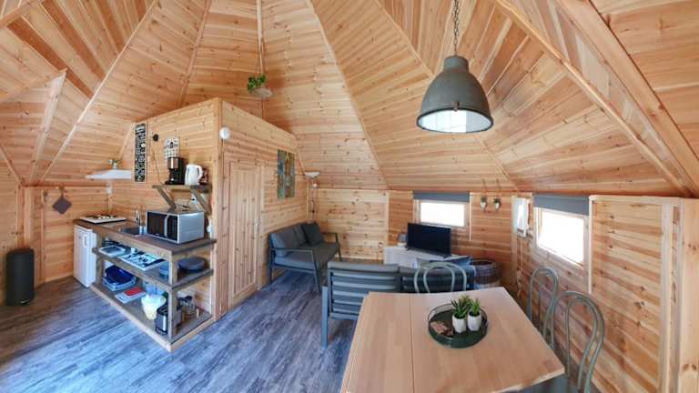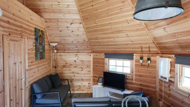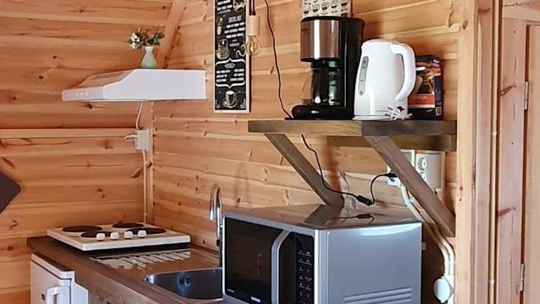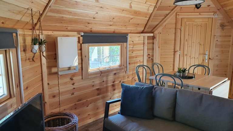Das Tiny House umfasst zwei Schlafzimmer, ein Wohnzimmer, ein Badezimmer mit Dusche sowie eine gut ausgestattete Küchenzeile mit Kühlschrank und Ofen. Eine Terrasse mit Blick auf den Pool ist ebenfalls vorhanden. Handtücher und Bettwäsche sind gegen Aufpreis verfügbar.