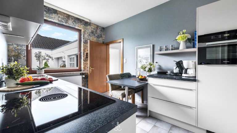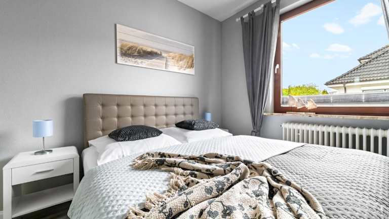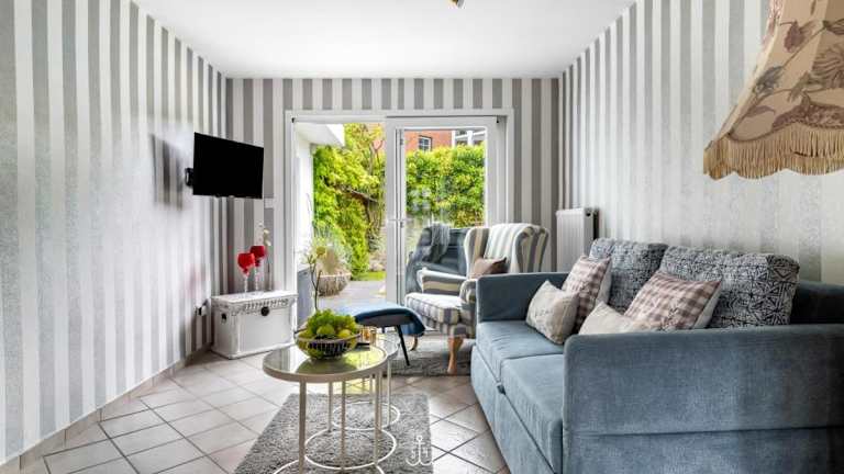 Die im Erdgeschoss liegende Ferienwohnung umfasst ein Schlafzimmer, eine gut ausgestattete Küche mit einem Kühlschrank und einem Geschirrspüler sowie ein Wohnzimmer. Außerdem ist ein TV vorhanden.