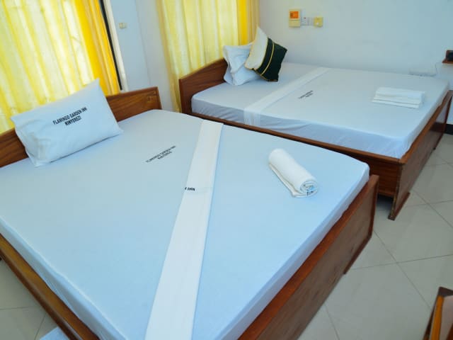 Die klimatisierten Zimmer im Flamingo Hotel Kinyerezi sind komfortabel und bieten einen Balkon mit Gartenblick. Jedes Zimmer verfügt über einen Flachbild-TV und ein eigenes Bad mit Dusche und Hausschuhen.
