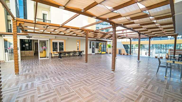 Entspannen Sie auf der Sonnenterrasse des Flamingo Residence und genießen Sie die warme Sonne und den atemberaubenden Blick auf die Berge. Die Unterkunft bietet auch einen saisonalen Außenpool, in dem Sie sich an heißen Tagen erfrischen können.