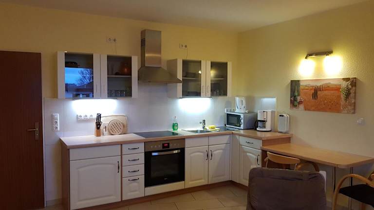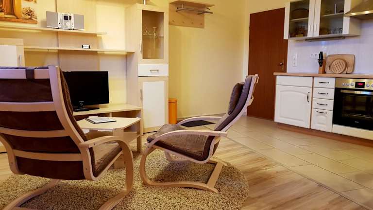 Das Flensburg Ferienwohnungen Apartment 2 bietet ein komfortables und gemütliches Ambiente. Das Apartment ist in warmen Farben gehalten und mit hellem Holzmobiliar ausgestattet. Es verfügt über eine voll ausgestattete Küche, in der Sie Ihre eigenen Mahlzeiten zubereiten können. Ein kleiner Esstisch und ein Wohnbereich mit Kabel-TV und Sesseln sind ebenfalls vorhanden. Kostenloses WLAN ist im Apartment verfügbar.