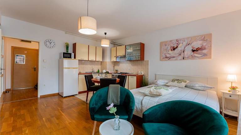 Das Studio Apartment umfasst 1 Schlafzimmer und ist mit einer Küche ausgestattet, die einen Kühlschrank und einen Ofen beinhaltet. Zudem verfügt die Unterkunft über ein Badezimmer mit einer Badewanne, einem Haartrockner und einer Waschmaschine. Ein Flachbild-TV ist ebenfalls vorhanden.