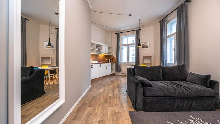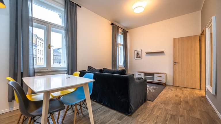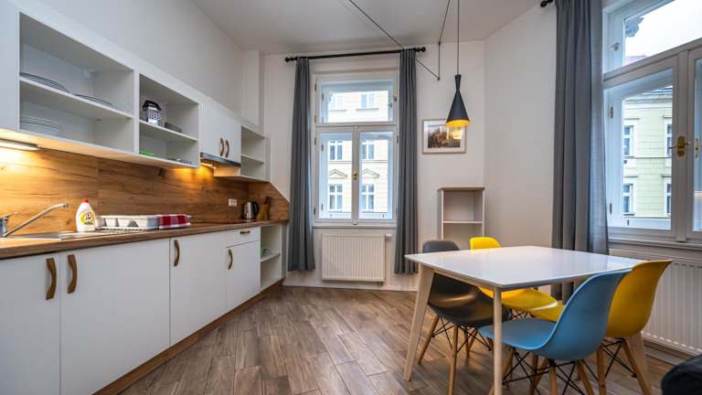 Die Wohneinheiten der Folimanka Apartments sind mit einem Sitzbereich, einer Waschmaschine und einer voll ausgestatteten Küche mit Kühlschrank ausgestattet. Continue with the description: Jedes Zimmer verfügt über ein eigenes Badezimmer mit Haartrockner. Zur Küchenausstattung gehören eine Mikrowelle, eine Herdplatte, ein Toaster und ein Wasserkocher. Die Apartments bieten Stadtblick.