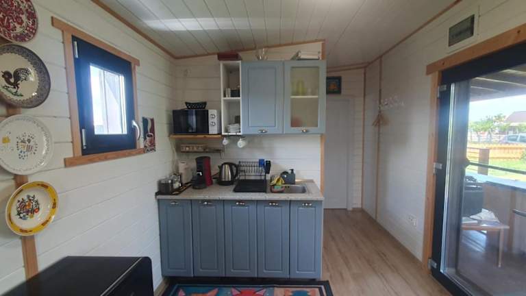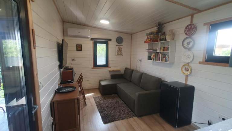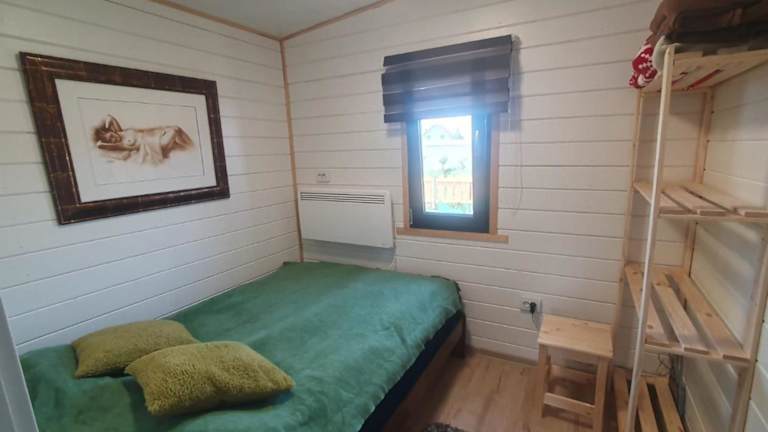Das Ferienhaus verfügt über ein Schlafzimmer, ein Wohnzimmer und eine voll ausgestattete Küche mit Kühlschrank und Kaffeemaschine. Das Badezimmer ist mit einer Dusche ausgestattet. Weitere Annehmlichkeiten umfassen eine Klimaanlage, Schallisolierung und Zugang zu einem Garten mit Möbeln.