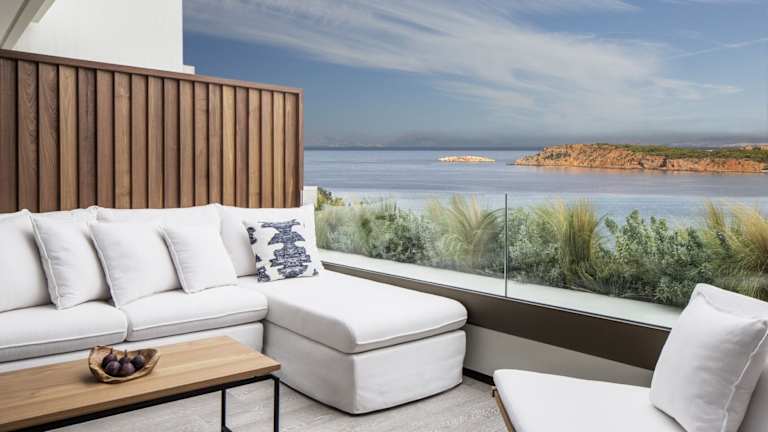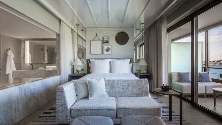 Die Zimmer und Suiten sind klimatisiert und elegant dekoriert. Sie verfügen über moderne Möbel, raumhohe Fenster und bieten teilweise Meer- oder Poolblick. Zur Standardausstattung gehören ein Doppelbett, eine Minibar, ein Safe, ein Fernseher mit Satellitenempfang, ein Telefon und kostenfreies WLAN. Die Badezimmer sind mit Dusche und Badewanne ausgestattet. Zusätzlich sind barrierefreie Zimmer verfügbar.