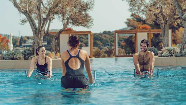 Das Hotel bietet ein breites Spektrum an Sport- und Freizeitmöglichkeiten. Dazu zählen Innen- und Außenpools, Tennisplätze, Wassersportarten wie Windsurfen und Kajakfahren, Yoga-Kurse, ein Fitnessstudio sowie Aerobic. Es gibt auch ein Wellnessbereich mit Spa, Sauna und verschiedenen Massageangeboten sowie Möglichkeiten zur Unterhaltung wie Live-Musik, eine Disco und ein Kinderclub.