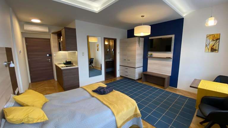 Die Wohneinheiten sind mit einem Esstisch, einem Flachbild-TV mit Kabelkanälen und einem eigenen Badezimmer mit Dusche, kostenlosen Pflegeprodukten und Haartrockner ausgestattet.