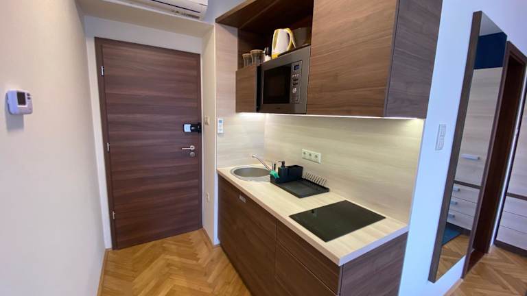 Es gibt eine voll ausgestattete Küchenzeile in jeder Wohneinheit, die einen Kühlschrank, eine Mikrowelle, eine Herdplatte sowie einen Wasserkocher umfasst.