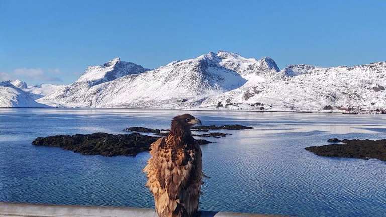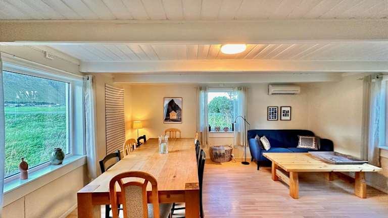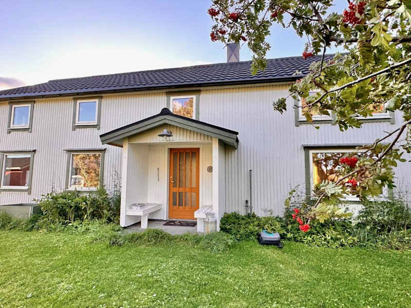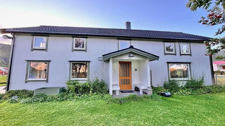 Fredvang, in der Nähe des Strandes Ytresand, mit Blick auf die umliegenden Berge und Zugang zu einem Garten. Der Strand Kolbeinsanden ist 1,4 km entfernt und der Flughafen Leknes liegt 38 km entfernt.