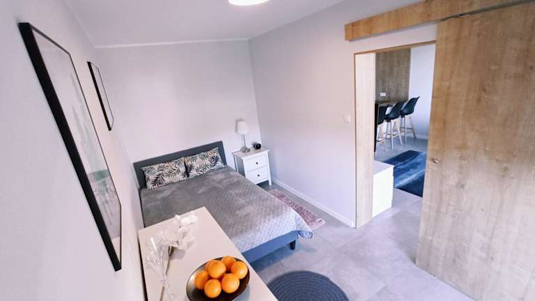 Die Ferienwohnung besteht aus einem Schlafzimmer, einem Wohnzimmer sowie einer voll ausgestatteten Küchenzeile mit Kühlschrank und Kaffeemaschine. Zudem verfügt sie über ein Badezimmer mit Dusche und Haartrockner. Handtücher und Bettwäsche werden bereitgestellt.