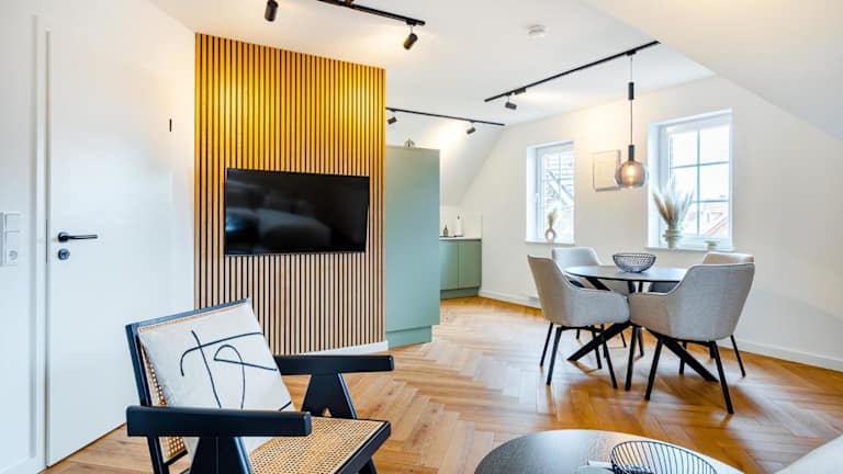 Die Ferienwohnung umfasst zwei Schlafzimmer, ein Wohnzimmer sowie eine voll ausgestattete Küchenzeile mit Kühlschrank und Kaffeemaschine. Zudem steht ein Badezimmer mit Dusche und Haartrockner zur Verfügung. Handtücher und Bettwäsche werden bereitgestellt.