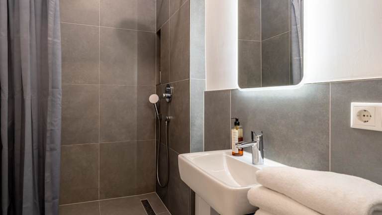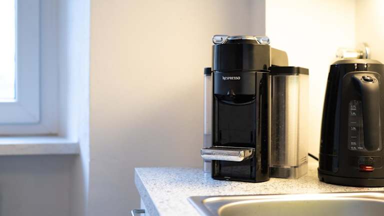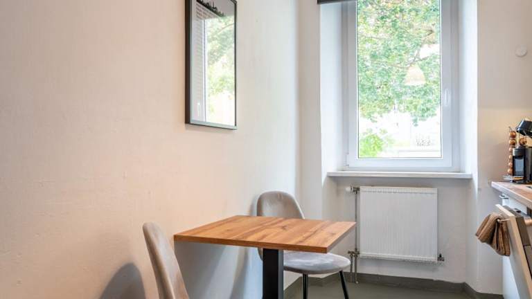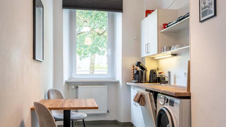 In der voll ausgestatteten Küche stehen ein Kühlschrank und eine Kaffeemaschine zur Verfügung. Es besteht die Möglichkeit, Essen in die Unterkunft liefern zu lassen. Es wird darauf hingewiesen, dass keine gemeinschaftlich genutzten Schreibwaren zur Verfügung stehen und Handdesinfektionsmittel bereitgestellt werden.