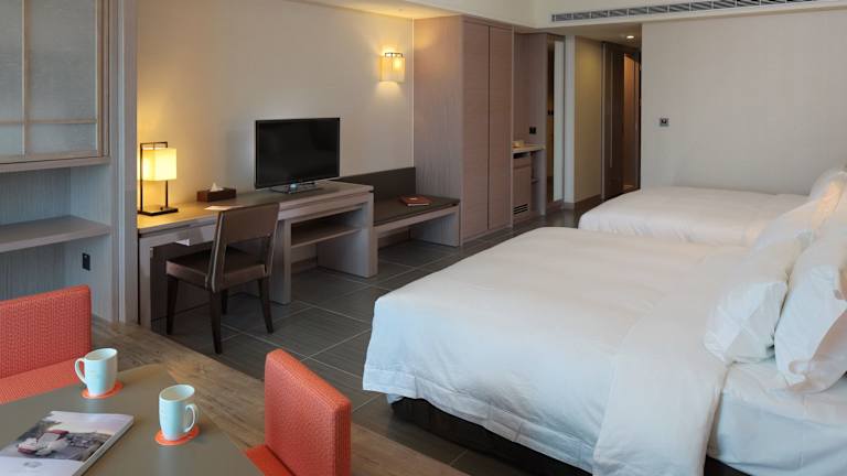 Die Zimmer sind klimatisiert und verfügen über ein Doppelbett sowie ein Sofabett. Es sind auch Baby- und Zustellbetten verfügbar. Die Ausstattung umfasst einen Safe, eine Minibar, einen Schreibtisch, einen Kühlschrank und eine Tee-/Kaffeemaschine. Technische Annehmlichkeiten wie ein Telefon, ein TV-Gerät und WLAN stehen bereit. Im Badezimmer befinden sich eine Dusche und eine Badewanne sowie ein Haartrockner und Kosmetikartikel.