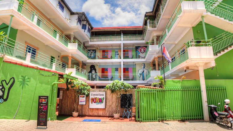 Das Hotel The Funky Village befindet sich in Siem Reap, nur wenige Gehminuten von der berühmten Pub Street entfernt. Die Lage ist ideal, um die Stadt zu erkunden und die nahe gelegenen Sehenswürdigkeiten wie Angkor Wat zu besichtigen.