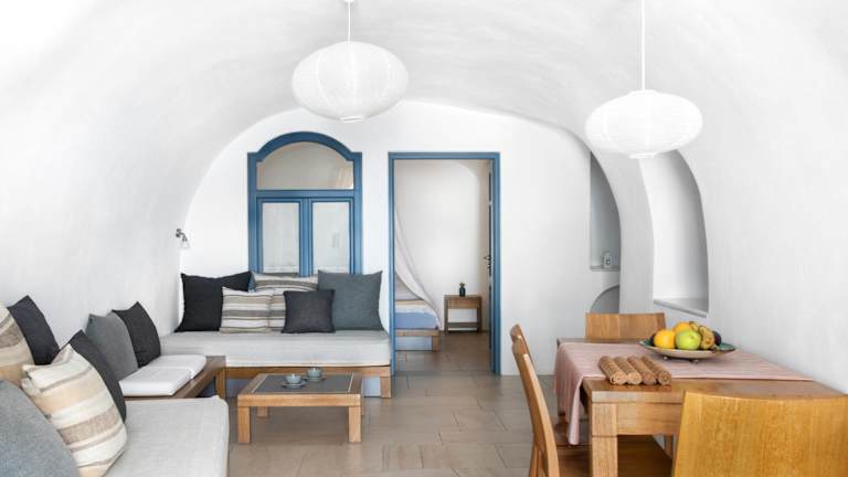 Das Gabbiano Traditional Cave Houses ist im typischen Stil von Santorin eingerichtet und bietet eine romantische Atmosphäre mit weißen Wänden. Die Unterkunft verfügt über voll ausgestattete Apartments, die ein Hauptschlafzimmer mit Baldachin und Kingsize-Bett, ein Wohnzimmer mit zusätzlichem Schlafplatz sowie eine Küche umfassen. Die Einrichtung ist durch natürliche und ökologische Materialien geprägt.