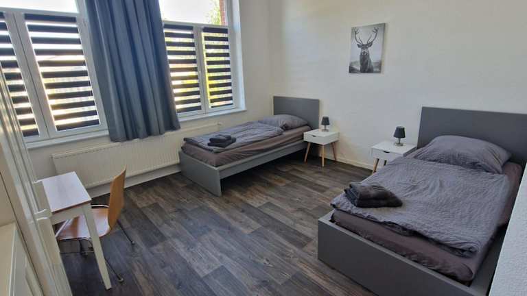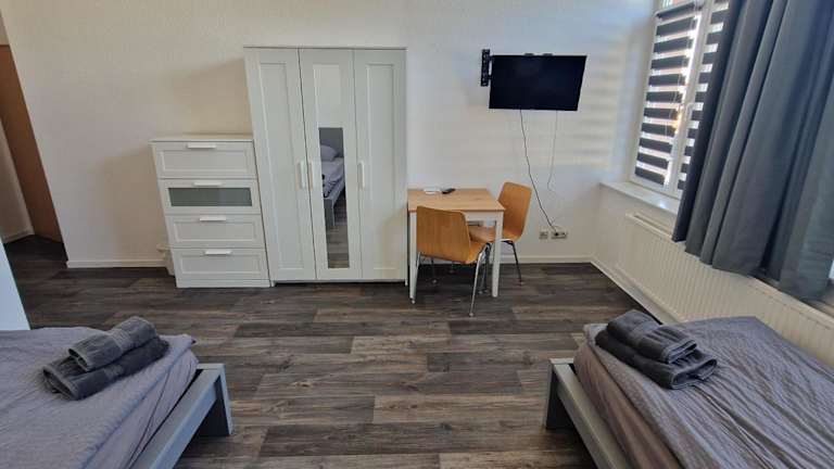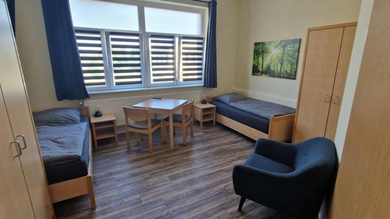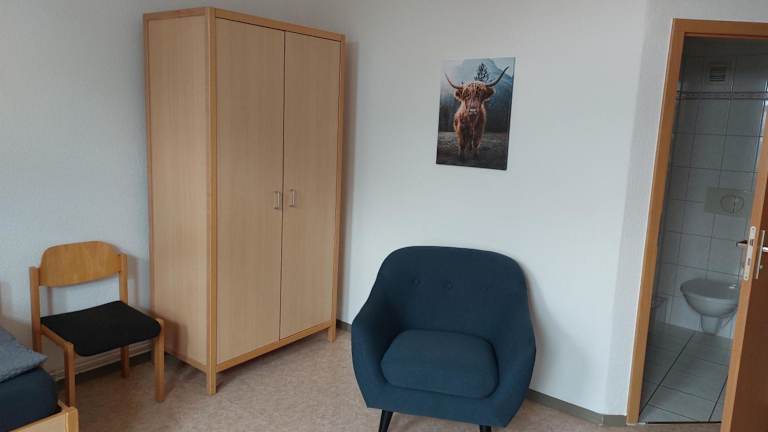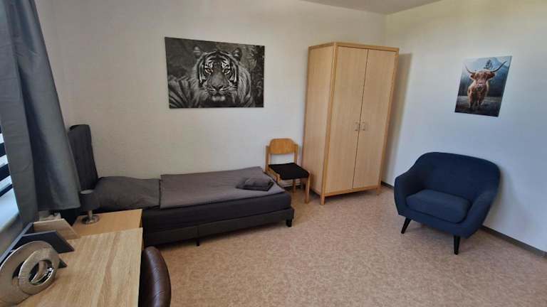 Die Zimmer im Gästehaus Heinrich Heine Schule sind gemütlich eingerichtet und verfügen über einen Kleiderschrank. Bettwäsche und Handtücher werden gestellt, um den Gästen einen angenehmen Aufenthalt zu ermöglichen.
