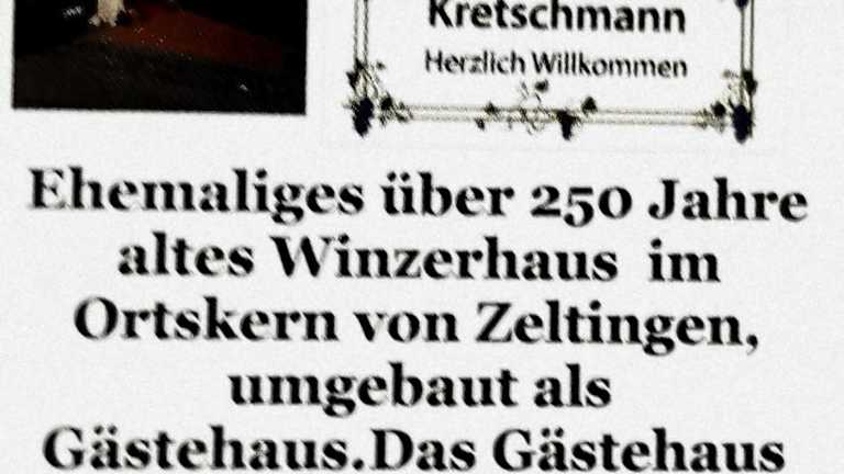Die Unterkunft Gästehaus Kretschmann liegt in Zeltingen-Rachtig, etwa 41 km vom Naturpark Saar-Hunsrück und 42 km von der Arena Trier entfernt. Der Hauptbahnhof Trier ist 44 km entfernt, während der Flughafen Frankfurt-Hahn in einer Distanz von 31 km erreichbar ist.