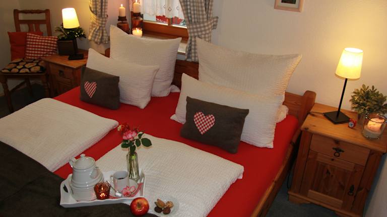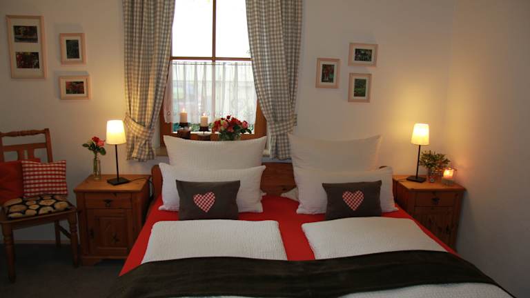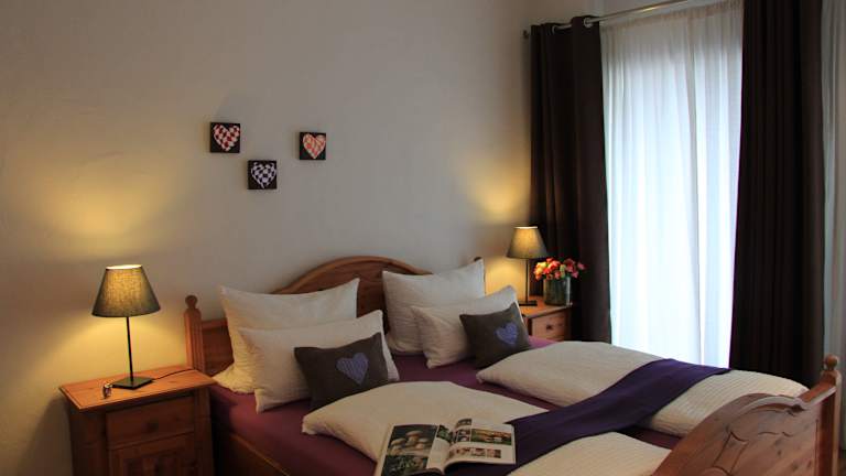 Bei uns erwarten Sie sechs großzügige Zimmer für jeweils zwei bis vier Personen, die zwischen 30 und 60 qm groß und im modernen Landhausstil eingerichtet sind. Zusammen mit kleinen dekorativen Details ist eine wohnliche Atmosphäre entstanden. Als Doppelzimmer genutzt haben alle Zimmer einen gemütlichen Sitzbereich oder ein separates Wohnzimmer. Jedes Zimmer ist individuell gestaltet, neben Holzmöbeln sind die Zimmer mit ausgesuchtem Kunstgewerbe eingerichtet. Farblich abgestimmte Akzente schaffen ein harmonisches Gesamtbild. Neben dem Radio-SAT-TV, kostenlosem W-LAN, Safe und Kofferablage, gibt es in den modern gestalteten Bädern mit Dusche/WC, einen Föhn, Schmink- und Rasierspiegel und eine kleine Auswahl an Kosmetikartikeln. Auf Anfrage sind auch Allergikerzimmer erhältlich.