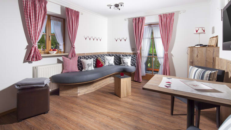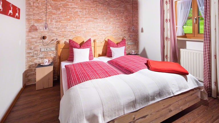Buchen Sie ein modernes, gemütliches Gästezimmer mit Balkon und Frühstück im großzügigen Frühstücksraum mit Blick zum Pool und Bergpanorama oder eine komfortable Ferienwohnung mit Balkon, mit oder ohne Frühstück.