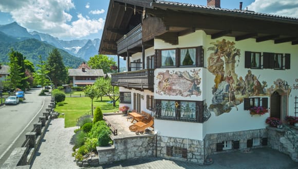 Gut wohnen in einem schönen Haus, gepflegtes und geschmackvoll eingerichtetes Gästehaus im Ortsteil Partenkirchen. Das schmucke, bayerische Landhaus wurde wegen seiner schönen Fassadenmalerei unter Denkmalschutz gestellt. Familienbetrieb, 24 Betten, umgeben von einer großen Gartenanlage mit Liegewiese.