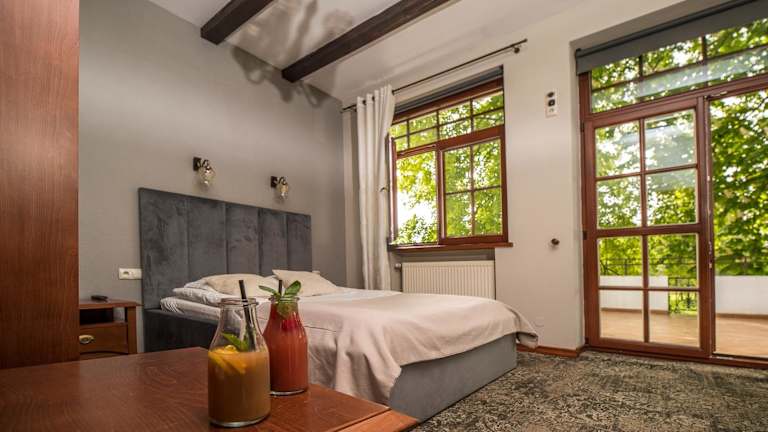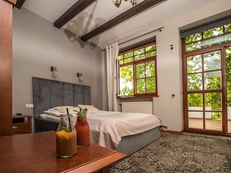 Die Zimmer im Dworek Biały Domek sind gemütlich eingerichtet und verfügen über eine Terrasse oder einen Balkon, auf denen Sie entspannen können. Zur Ausstattung gehören ein Flachbild-TV, kostenfreies WLAN und ein eigenes Bad mit Dusche, kostenfreien Pflegeprodukten und einem Haartrockner.