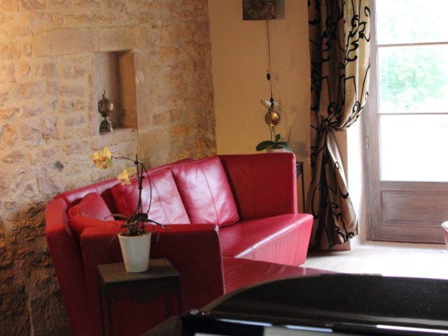 Les Pensées d 'Or ist ein "Chambre d ' Hôtes". Das heißt, Sie sind Gast in unserem Hause.Wir bieten Ihnen ein großzügiges Gästeappartement. Die stimmungsvolle, authentische renovierte "Grange" ist auf zwei Etagen aufgeteilt. Sie wohnen und schlafen unter der ursprünglichen Eiche Dach-Balken. Die Außenwände sind traditionell mit Kalk und Hanf isoliert, die Innenwände bestehen aus "Pierre Apparente" (Burgundisches Mauerwerk). Die Grange ist geschmackvoll eingerichtet, bietet einen wunderschönen Blick über die grüne Hügellandschaft und ist mit allen Luxus und Komfort ausgestattet. Über die Treppe erreichen Sie die Suite im ersten Stock: Wohn-Schlafzimmer + Zimmer mit Waschbecken und Kleiderschrank + separates WC (38 m 2), • 1 Doppelbett oder 2 Einzelbetten (neue Matratzen) • bequemes Sofa, • Nespresso Kaffee Maschine, Wasserkocher, Kaffeekapseln, Tee, Obst, Mineralwasser • drahtloses Internet (Wi-Fi) • HD-TV mit Satellit Empfang (z. B. DE Kanäle) plus Netzwerk-Anschluss (für Musik) • Luxus B & O Radio CD-Spieler für Ihre eigenen CD’s • Bademäntel, Föhn Im Erdgeschoss benutzen Sie außerdem: private Lounge (28 m ²) + Bad mit begehbarer Dusche und WC + große Terrasse • Doppelte Flügeltüren zur Terrasse • Sonos-Musiksystem mit Netzwerkanschluss • Blick auf Wiesen und Obstbäume, • Komfortable Ledersitzecke • Wechselnde Kunstgegenstände und Gemälde • Blüthner Flügel aus 1930! Fragen Sie uns bitte, wenn Sie auf dem Flügel spielen wollen? Tipp: nehmen Sie Ihre eigene Blattmusik mit! Übrigens...