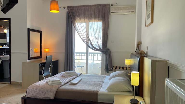 Die Zimmer im Galini Hotel sind mit einem Balkon mit Meerblick ausgestattet und bieten kostenloses WLAN. Jedes Zimmer verfügt über eine Klimaanlage, einen Kleiderschrank, eine Terrasse mit Stadtblick, ein eigenes Badezimmer, einen Flachbild-TV sowie Bettwäsche und Handtücher. Außerdem stehen den Gästen Kühlschränke in den Zimmern zur Verfügung.