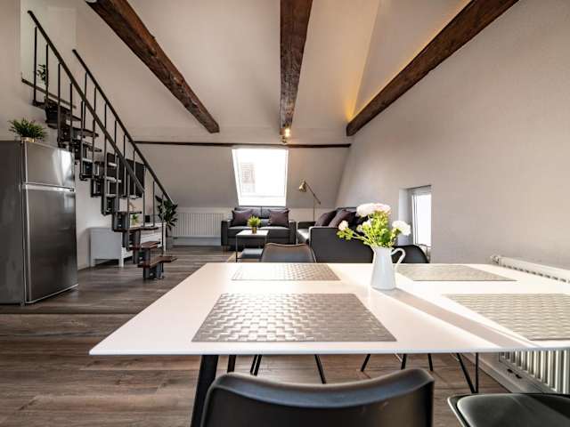 Die Wohnung ist mit einem Sitzbereich, einem Flachbild-TV mit Kabelkanälen, einer Küche, einem Essbereich und einem eigenen Badezimmer ausgestattet. Das Badezimmer verfügt über eine Dusche und einen Haartrockner. Zur Ausstattung gehören zudem Bettwäsche und Handtücher.