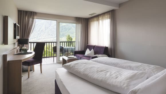 Die einmalige Lage an den sonnigen Hängen des Küchelberges bietet Ihnen die schönste Aussicht auf Meran und die umliegende Bergwelt. Uneingeschränkt können Sie ihren Blick von der Terrasse, der Liegewiese oder Ihrem Zimmer über dieses einmalige Panorama schweifen lassen.