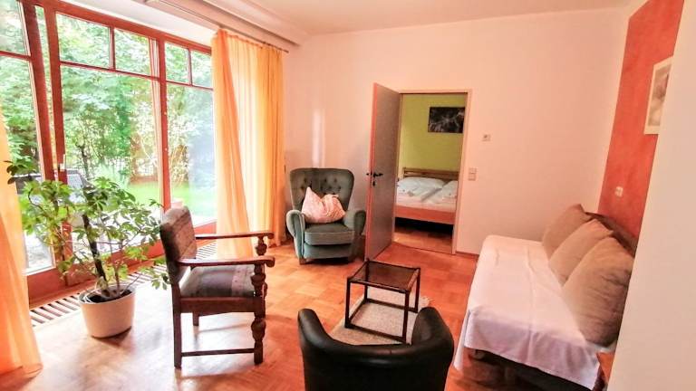 Das Gartenapartment bietet Übernachtungsmöglichkeiten mit Gartenblick, einer Veranda/Patio und Kaffeemaschine. Es verfügt über eine Terrasse mit Bergblick, zwei Schlafzimmer, ein Wohnzimmer und zwei Badezimmer. Kostenloses WLAN und Privatparkplätze sind verfügbar. Die Unterkunft ist eine Nichtraucherunterkunft und wird von einem privaten Gastgeber geführt.