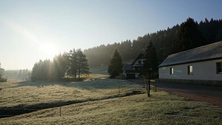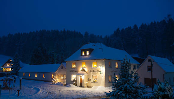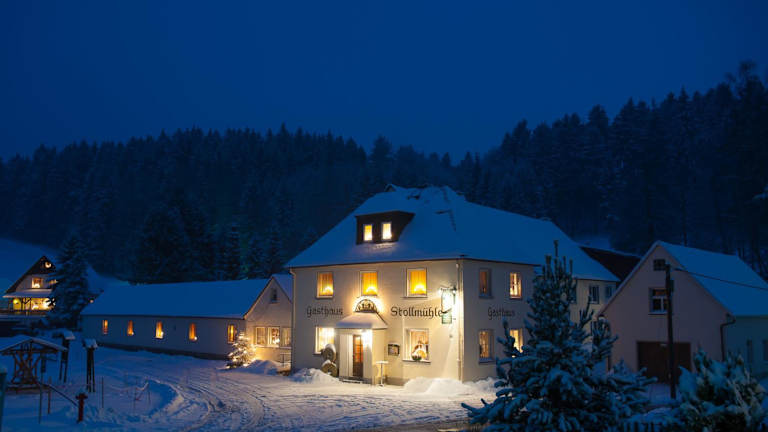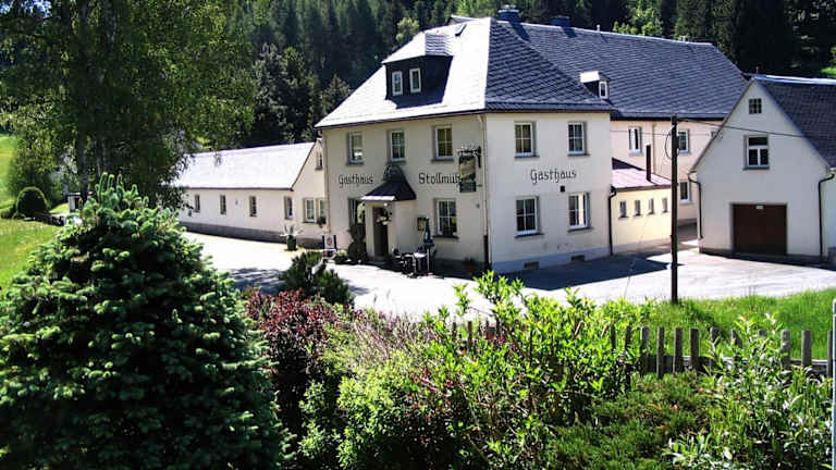Das Gasthaus Stollmühle befindet sich in Stützengrün und ist von der idyllischen grünen Hügellandschaft des Erzgebirges umgeben. In nur 10 Minuten erreichen Sie zu Fuß die Station Neulehn der Schmalspurbahn Schönheide, die bereits 1881 eröffnet wurde. Die Umgebung bietet zahlreiche Möglichkeiten zum Wandern, Radfahren und Langlaufen. Nehmen Sie sich Zeit, den Bergwiesenlehrpfad zu erkunden oder einen Spaziergang rund um die Talsperre Eibenstock zu unternehmen.