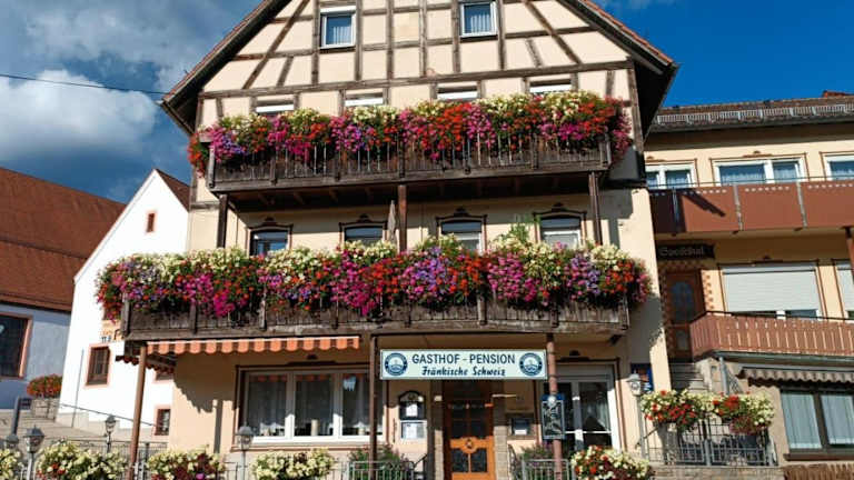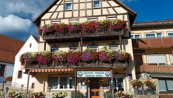 Die Gasthof-Pension Fränkische Schweiz Obertrubach bietet Übernachtungsmöglichkeiten mit einer Gemeinschaftslounge, kostenlosem Privatparkplatz, einer Terrasse und einem Restaurant. Die Unterkunft ermöglicht es den Gästen, einen Zimmerservice zu nutzen und bietet kostenloses WLAN.