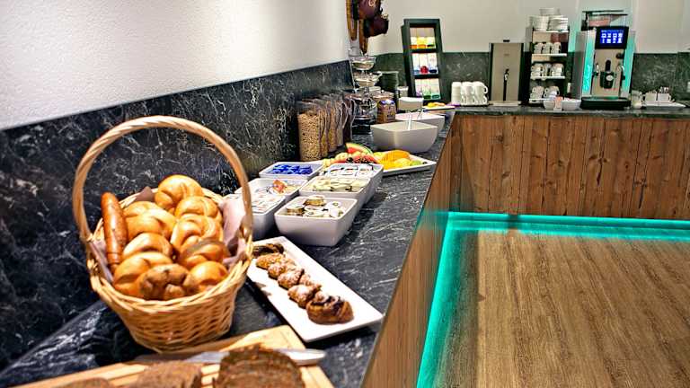 Beginnen Sie Ihren Morgen mit einem vielfältigen Frühstücksbuffet, das keine Wünsche offenlässt: Feine Wurst- und Käsespezialitäten, frisches Obst, Müsli und eine Vitalecke, knusprig gebratener Speck, Eier und Rührei, frisch gebackene Brötchen, Marmeladen, eine Auswahl an Säften von der Saftbar, Kaffeespezialitäten sowie eine erlesene Teevielfalt von Ronnefeldt.