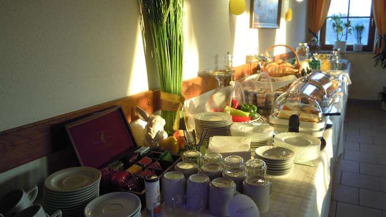 Das Gästehaus Zur schönen Aussicht bietet keine Verpflegungsmöglichkeiten vor Ort, aber in der Umgebung gibt es Restaurants und Cafés, in denen Sie lokale Spezialitäten genießen können.