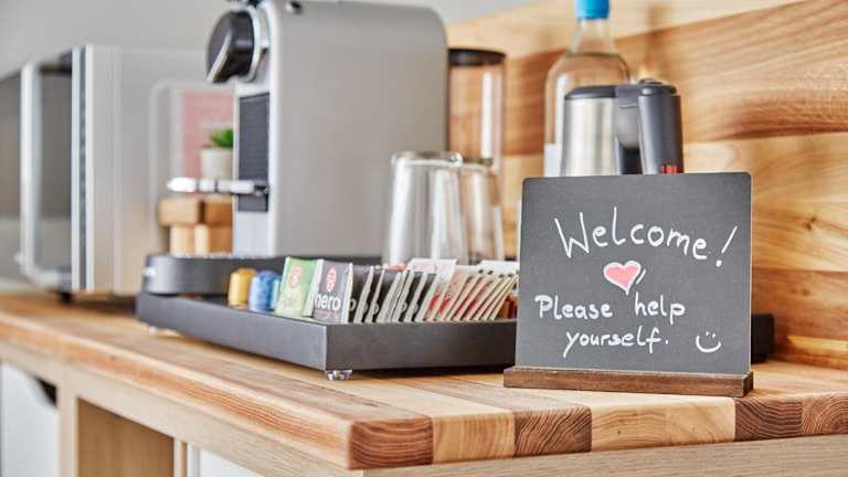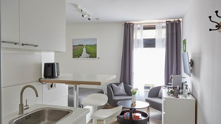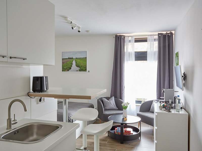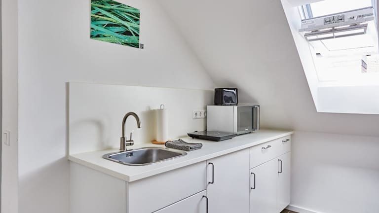 Die Wohneinheiten sind mit einer voll ausgestatteten Küchenzeile ausgestattet, die unter anderem über eine Mikrowelle, eine Herdplatte, einen Toaster, eine Kaffeemaschine und einen Wasserkocher verfügt.