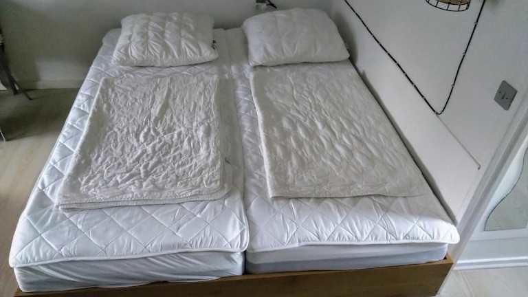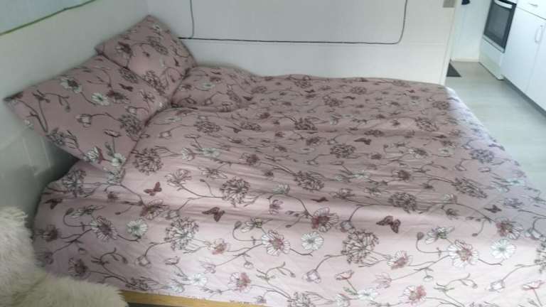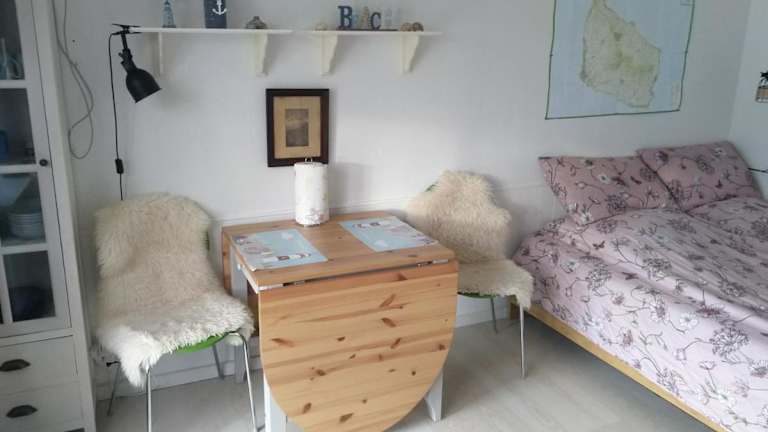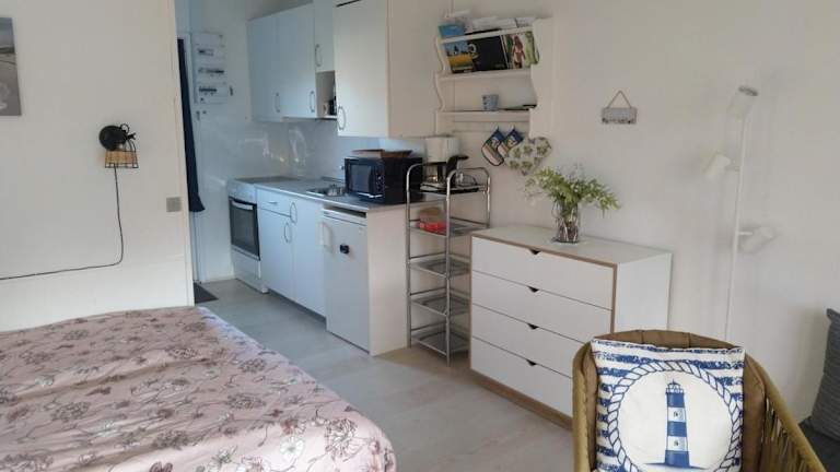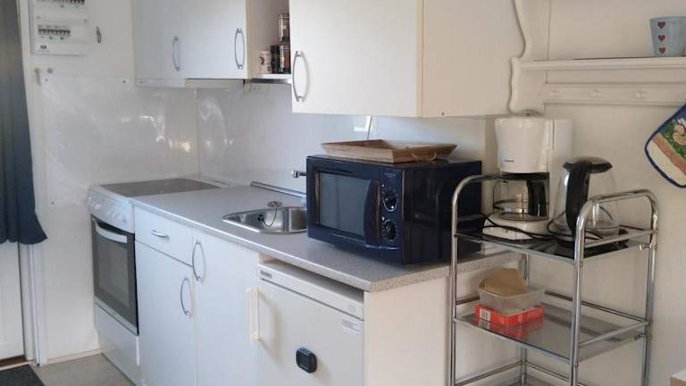 Die Küchenzeile ist mit einem Kühlschrank, einem Ofen, einer Herdplatte, einer Kaffeemaschine und einem Wasserkocher ausgestattet, was eine komfortable Selbstversorgung ermöglicht.