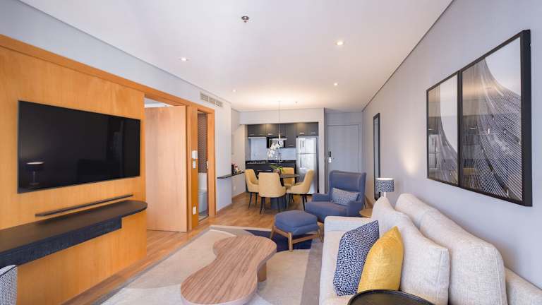 Die Zimmer sind klimatisiert und bieten ein modernes Raumklima. Die meisten Zimmer verfügen über einen Balkon und sind mit einem Doppelbett, Queensize-Bett oder Kingsize-Bett ausgestattet. Jedes Zimmer beinhaltet zudem eine umfassend ausgestattete Kochnische mit Kühlschrank, Mikrowelle und Tee-/Kaffeemaschine. Zu den weiteren Annehmlichkeiten gehören ein Safe, eine Minibar, ein TV und kostenloses WLAN. Die Badezimmer sind sowohl mit Dusche als auch mit Badewanne ausgestattet und bieten Haartrockner und Bademäntel.