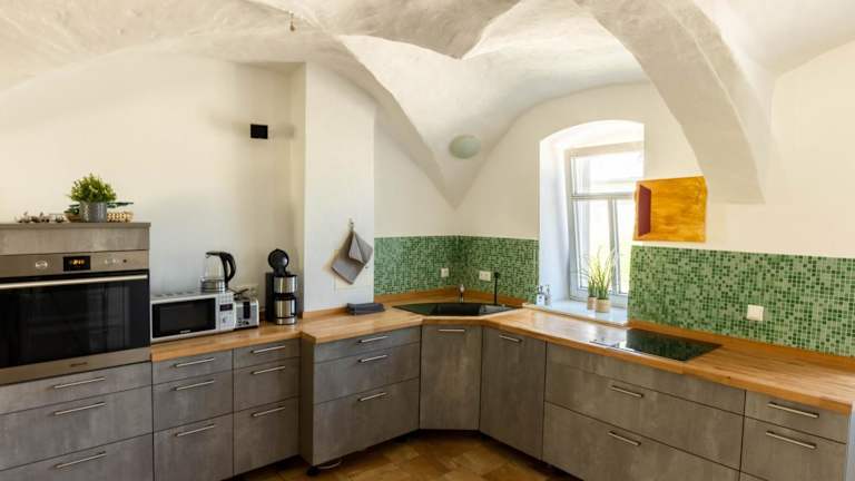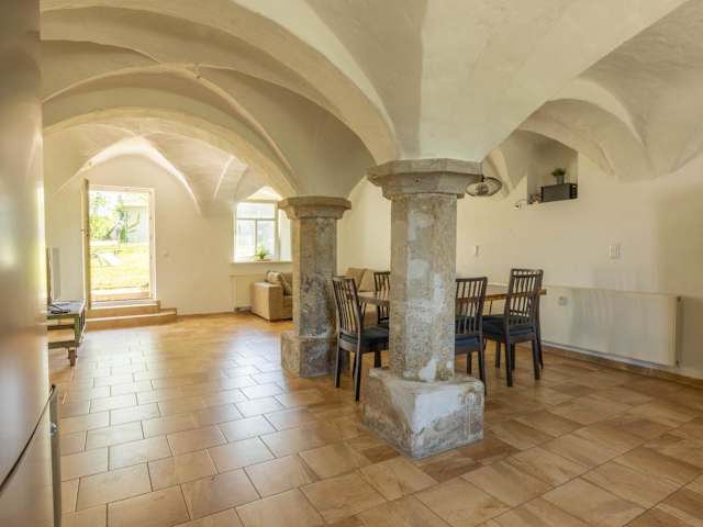 Das Apartment im Hotel Gewölbe besteht aus 4 separaten Schlafzimmern, die Platz für mehrere Gäste bieten. Die Zimmer sind gemütlich und mit historischen Details ausgestattet. Eine voll ausgestattete Küche ermöglicht es den Gästen, ihre eigenen Mahlzeiten zuzubereiten. Das Badezimmer ist modern und gut ausgestattet. Vom Apartment aus haben die Gäste einen herrlichen Blick auf den Garten.