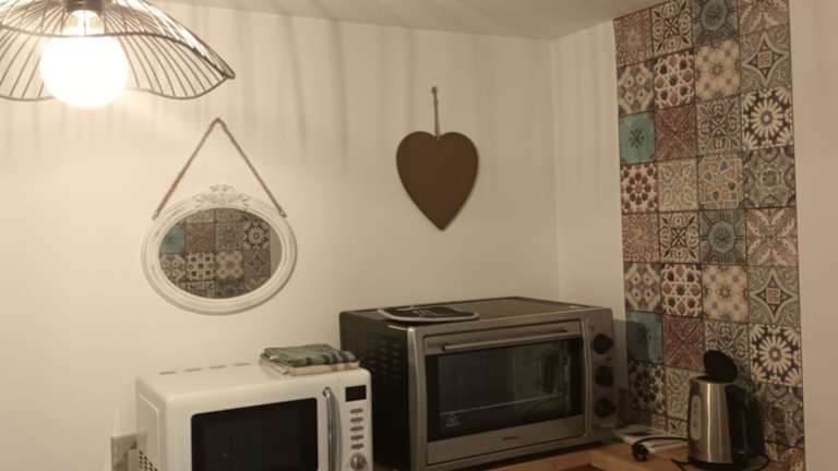 Die Ferienwohnung verfügt über ein Schlafzimmer und ein Wohnzimmer. Eine voll ausgestattete Küchenzeile beinhaltet unter anderem einen Kühlschrank und eine Kaffeemaschine. Zur weiteren Ausstattung gehören ein Badezimmer mit Dusche sowie ein Haartrockner. Handtücher und Bettwäsche werden bereitgestellt.