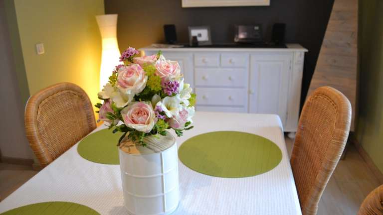 In der voll ausgestatteten Küche des Ferienhauses können Sie Ihre eigenen Mahlzeiten zubereiten und den Komfort eines eigenen Essbereichs genießen. Alternativ können Sie in der Umgebung Restaurants und Cafés entdecken, in denen Sie lokale Spezialitäten probieren können.