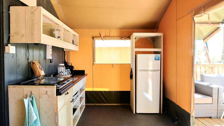 Die Zelt-Lodge umfasst einen Sitzbereich, einen Essbereich und eine vollständig ausgestattete Küche mit Kühlschrank. WLAN und Klimaanlage sind ebenfalls vorhanden.