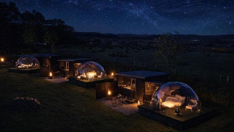 Glamping Domes bietet eine naturnahe Übernachtungsmöglichkeit mit kostenlosem WLAN, einem Garten, einer Terrasse und Meerblick. Die Unterkunft sorgt für einen entspannten Aufenthalt mit Grillmöglichkeiten sowie Zugang zu einer Sauna und einem Whirlpool. Die Regeln der Unterkunft beinhalten, dass keine Feiern erlaubt sind und Mindestalter für den Check-in sowie Gäste bei 18 Jahren liegt.