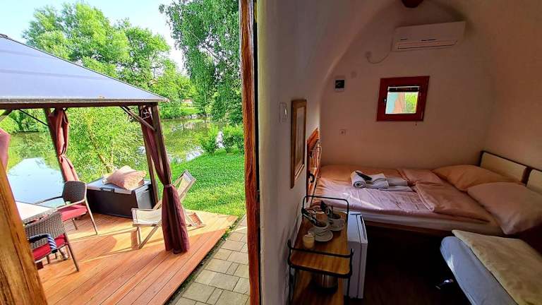 Die klimatisierten Unterkünfte im Glamping Rajska vas sind komfortabel und modern eingerichtet. Jede Unterkunft verfügt über eine Terrasse, auf der Sie den Blick auf den See genießen können. Zur Ausstattung gehören auch ein Flachbild-TV und ein eigenes Badezimmer mit einer Dusche und kostenlosen Pflegeprodukten. Ein Kühlschrank und ein Wasserkocher stehen ebenfalls zur Verfügung.