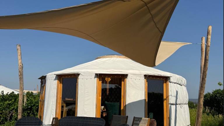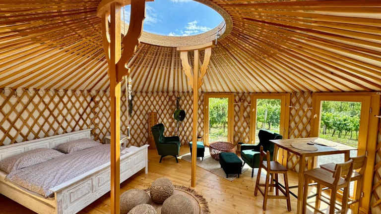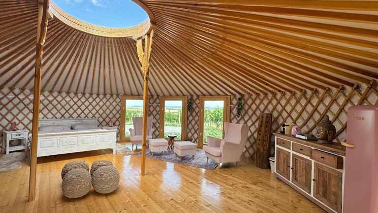 Glamping ve vinohradu, Jurty Marcipan - Jižní Morava bietet Übernachtungsmöglichkeiten in Jurten mit Klimaanlage und Zugang zu einem Garten mit Terrasse. Die Unterkunft wird von einem privaten Gastgeber betrieben und ist für Gäste ab 18 Jahren zugänglich. Junggesellen- und Junggesellinnenabschiede sind nicht erlaubt. Haustiere sind auf Anfrage gestattet und es können Gebühren anfallen.