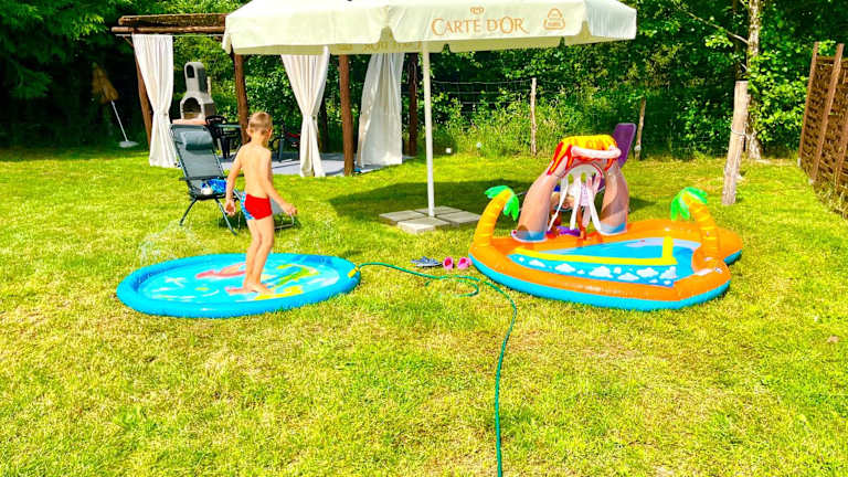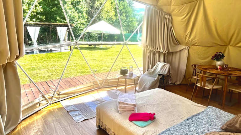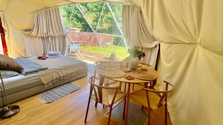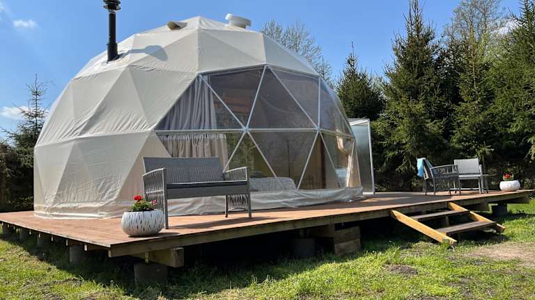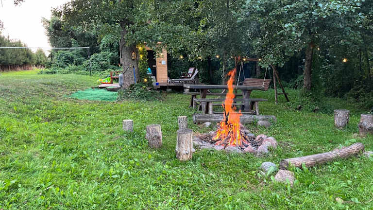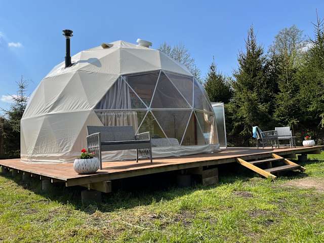 Glamping w sercu mazur z prywatną plażą ist eine Zelt-Lodge, die durch eine Terrasse und eine Klimaanlage besticht. Die Unterkunft wird von einem privaten Gastgeber geführt und bietet einen Garten sowie kostenlosen Privatparkplatz. Es sind keine Feierlichkeiten wie Junggesellenabschiede gestattet.