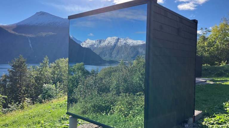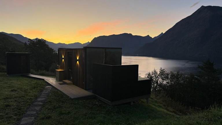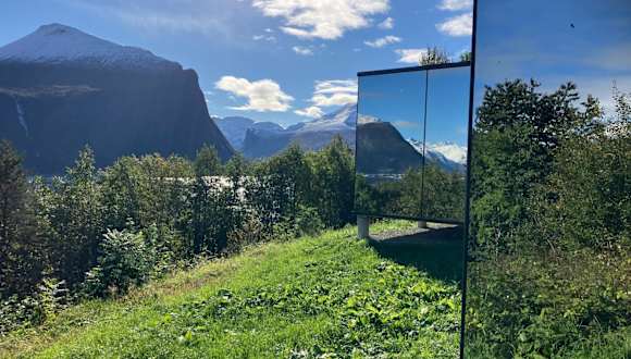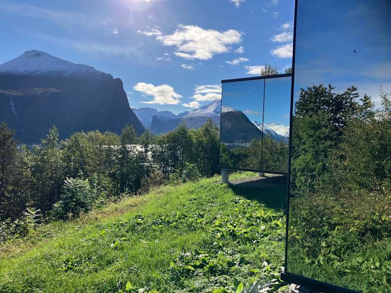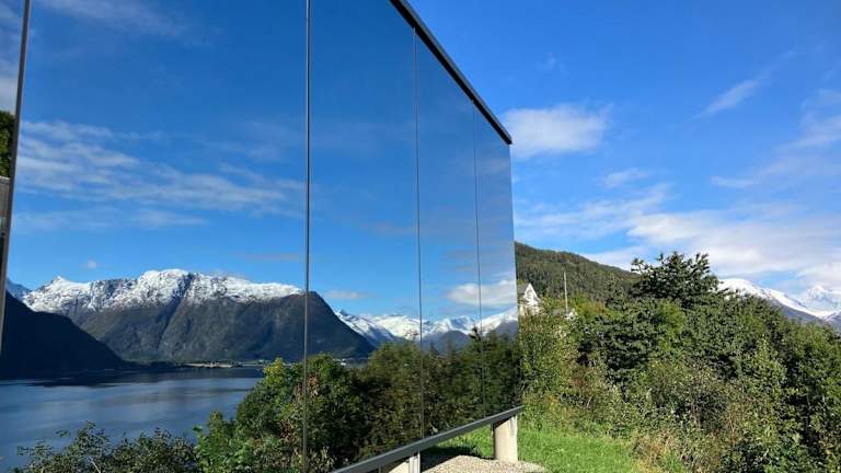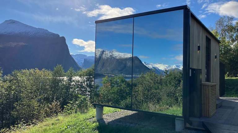 Glimre Romsdal - Eksklusivt speilhus ved Åndalsnes ist ein exklusives Ferienhaus mit Veranda/Patio, das einen direkten Blick auf das Meer ermöglicht. Es bietet modernen Komfort und eine private Atmosphäre.